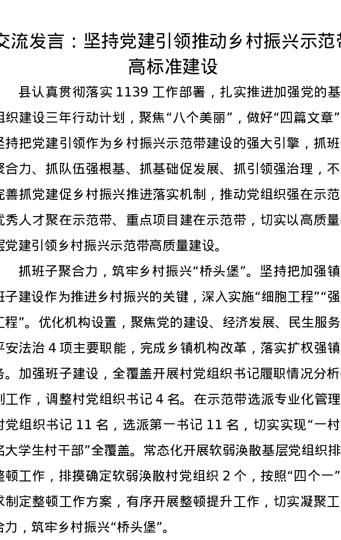 交流发言:坚持党建引领推动乡村振兴示范带高标准建设