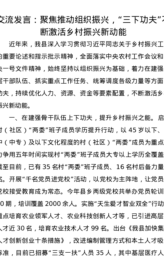 交流发言:聚焦推动组织振兴,“三下功夫”不断激活乡村振兴新动能