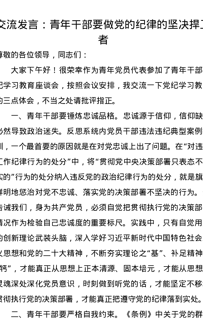 交流发言:青年干部要做党的纪律的坚决捍卫者