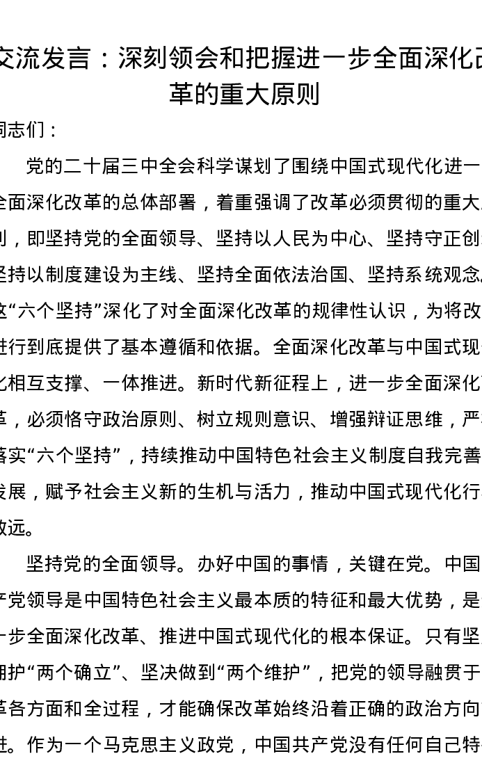交流发言:深刻领会和把握进一步全面深化改革的重大原则