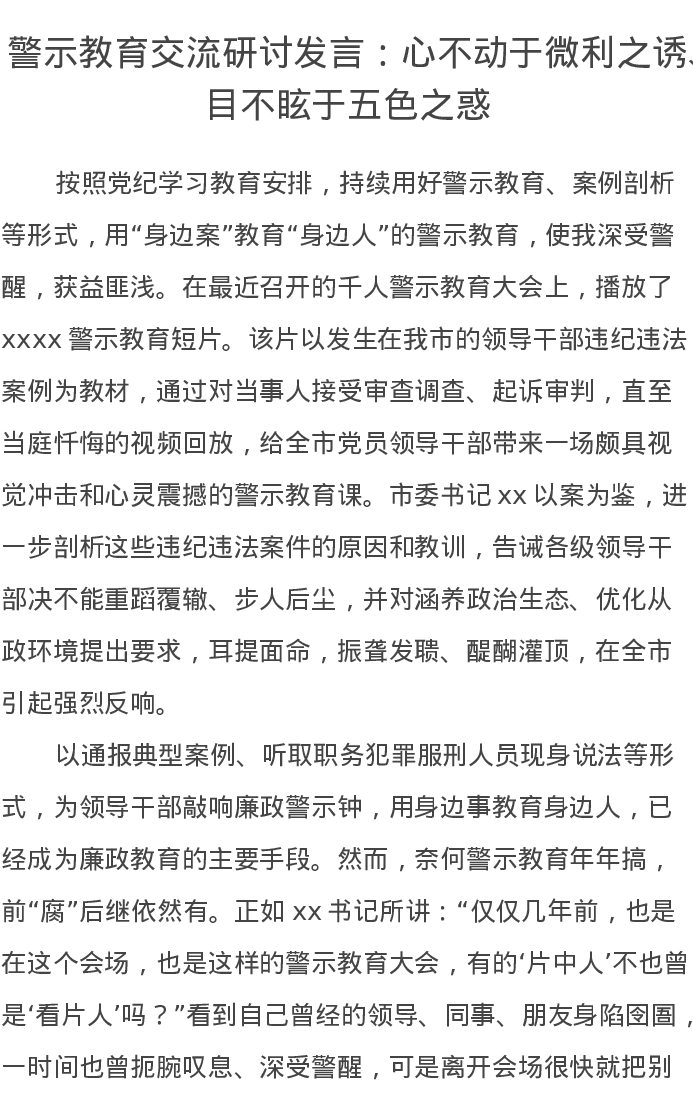 警示教育交流研讨发言:心不动于微利之诱、目不眩于五色之惑
