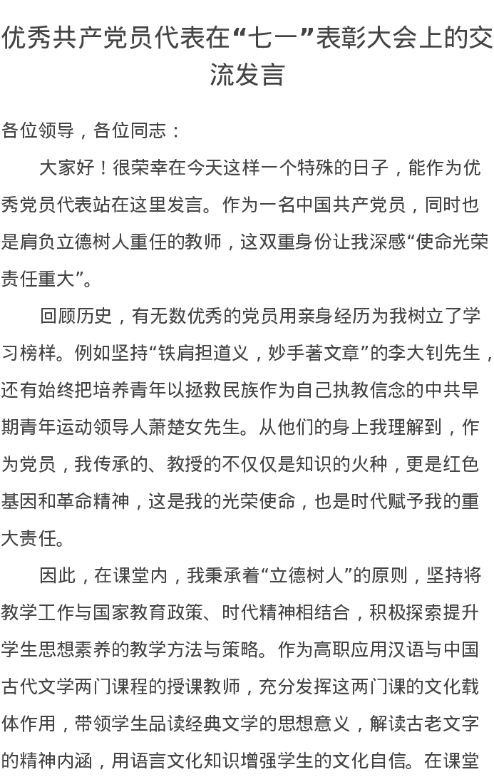两优一先代表在“七一”表彰大会上的交流发言(党员、党组织)