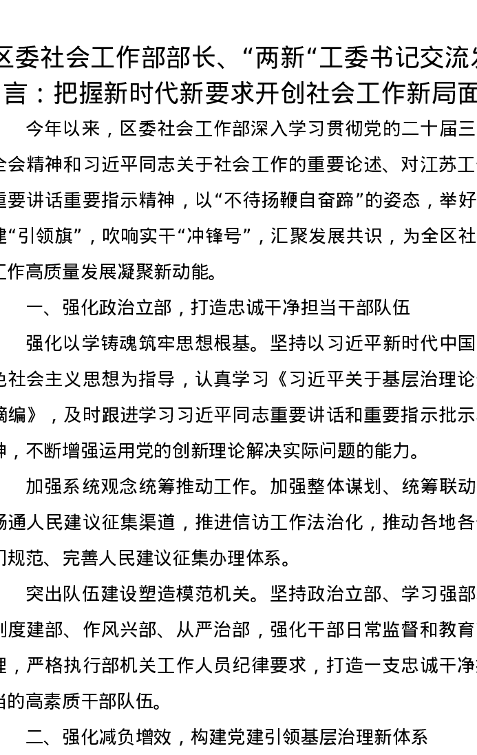 区委社会工作部部长、“两新“工委书记交流发言:把握新时代新要求开创社会工作新局面