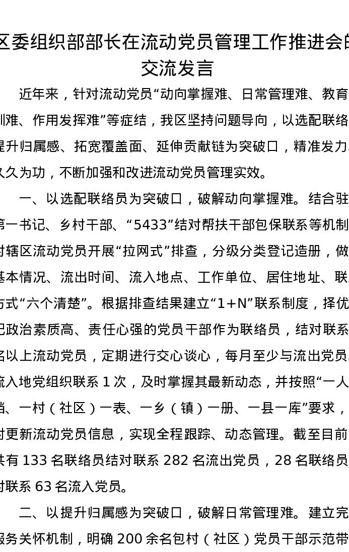 区委组织部部长在流动党员管理工作推进会的交流发言
