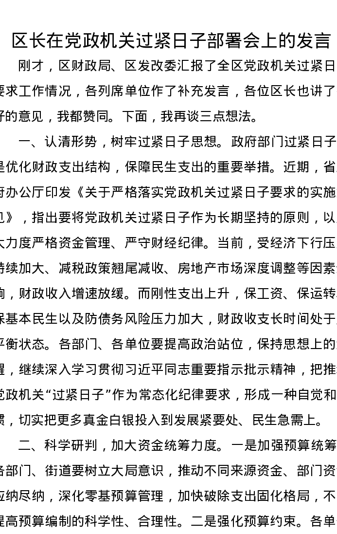 区长在党政机关过紧日子部署会上的发言