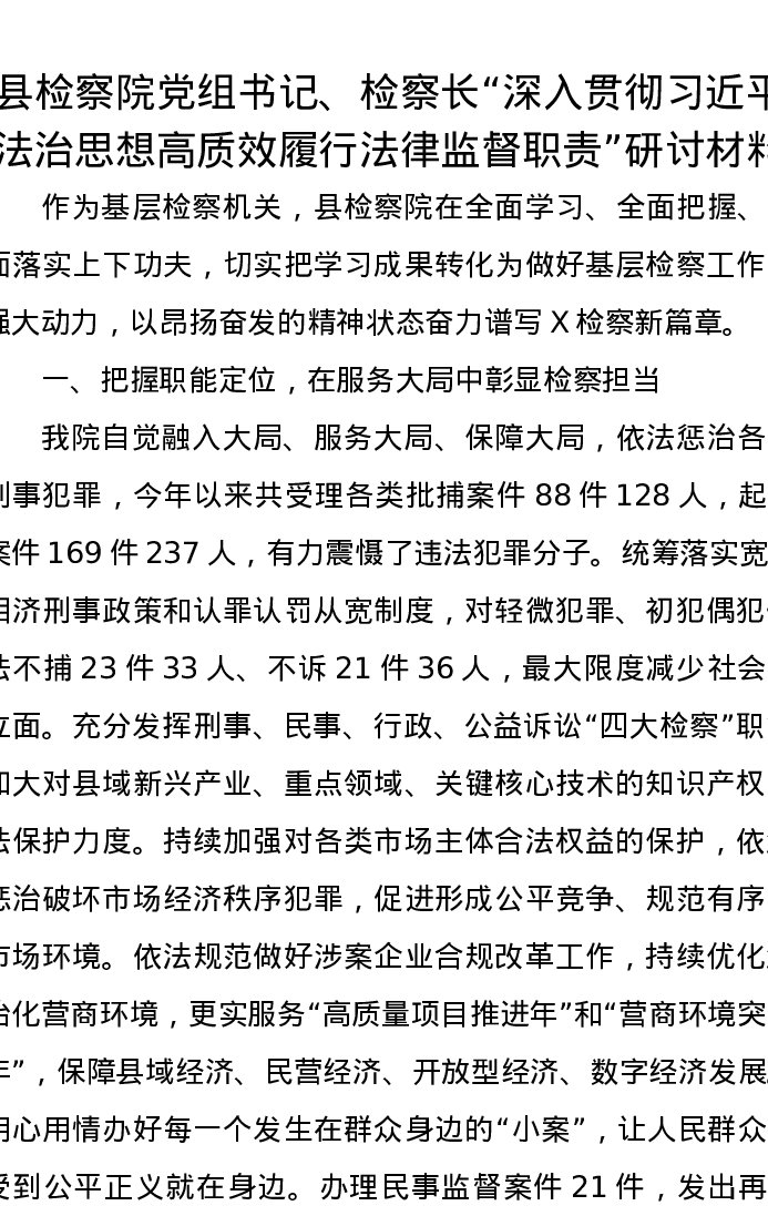 县检察院党组书记、检察长“深入贯彻习近平法治思想高质效履行法律监督职责”研讨材料