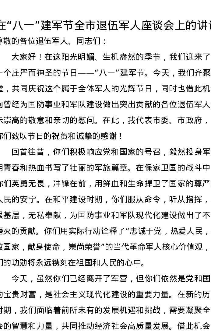 在“八一”建军节全市退伍军人座谈会上的讲话