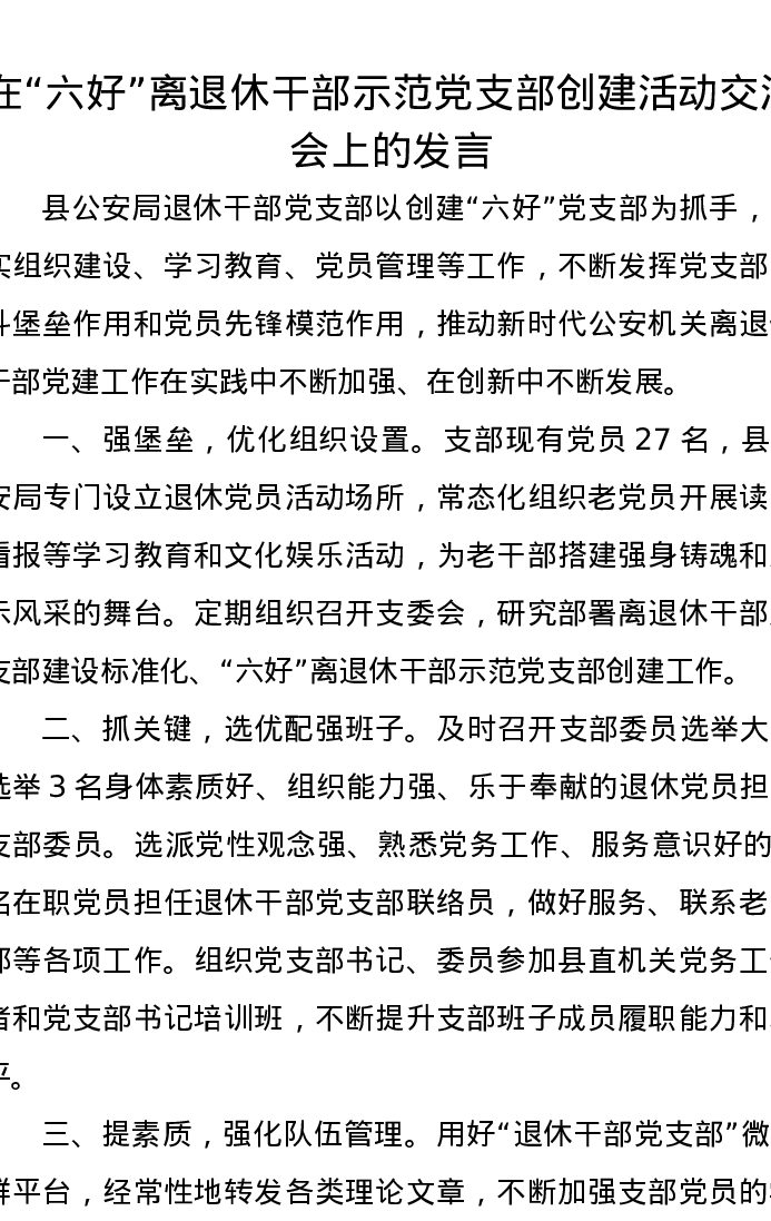 在“六好”离退休干部示范党支部创建活动交流会上的发言