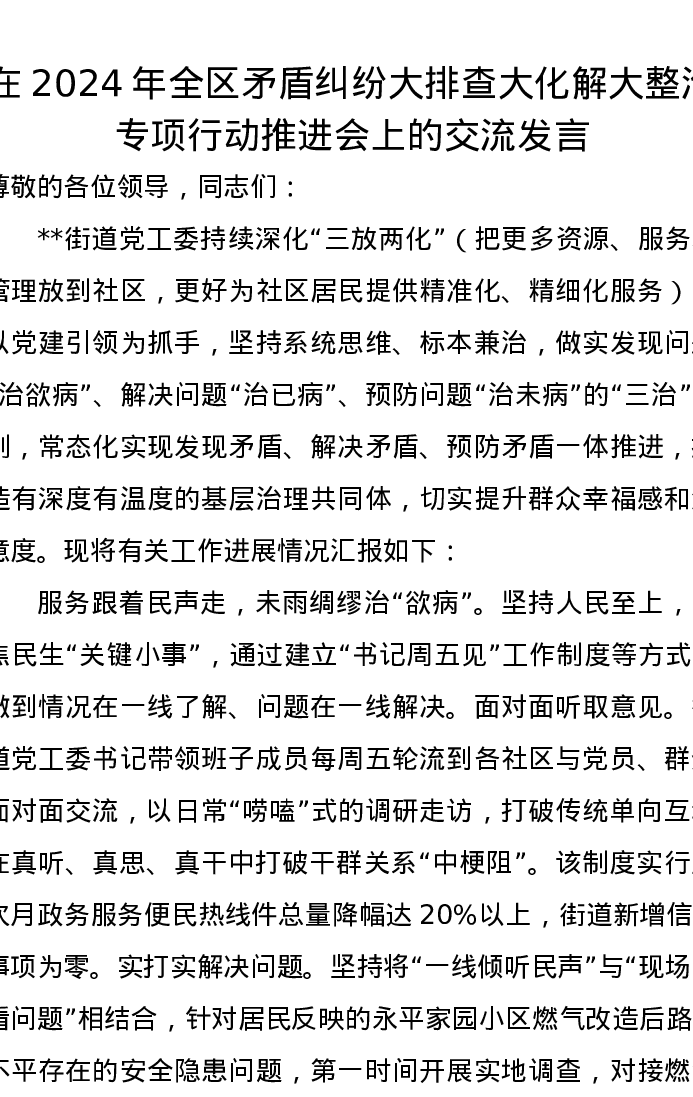在2024年全区矛盾纠纷大排查大化解大整治专项行动推进会上的交流发言