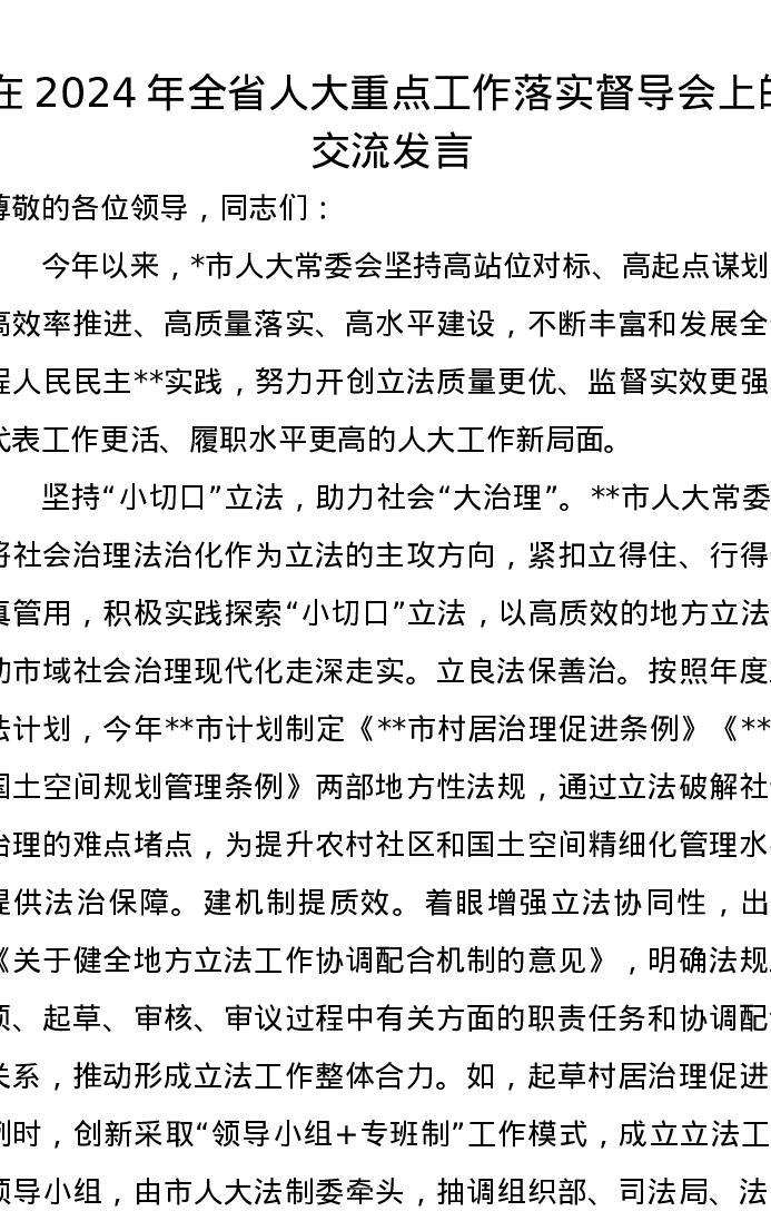 在2024年全省人大重点工作落实督导会上的交流发言