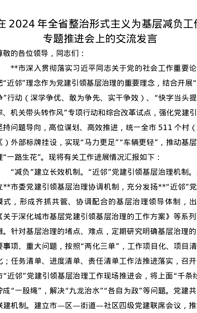 在2024年全省整治形式主义为基层减负工作专题推进会上的交流发言