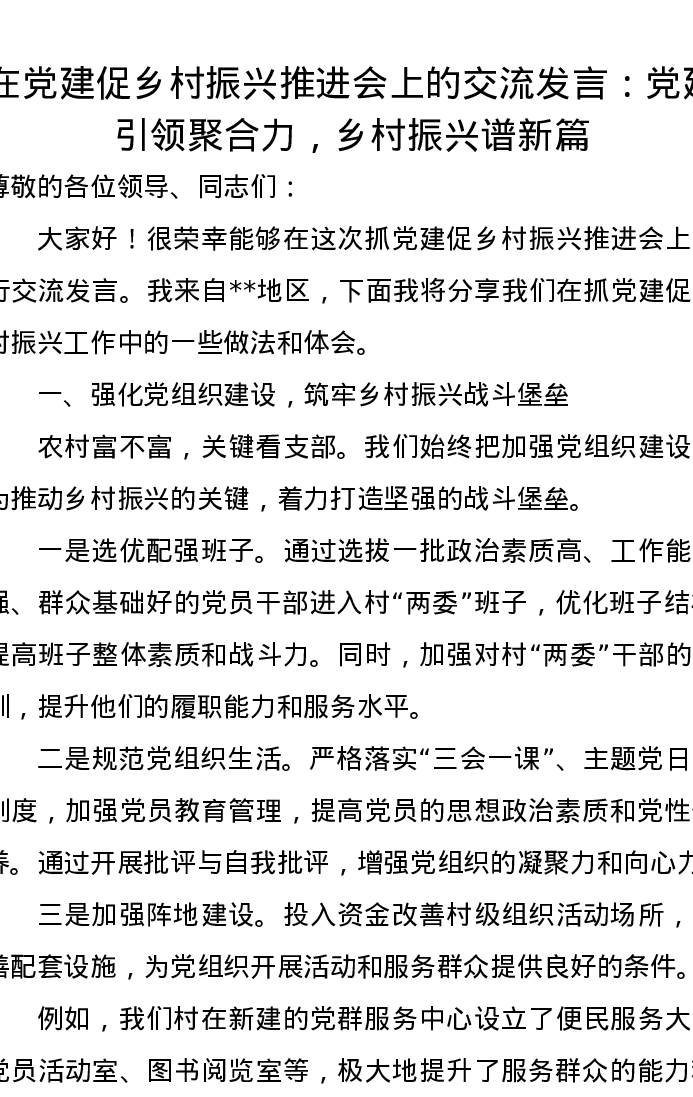 在党建促乡村振兴推进会上的交流发言:党建引领聚合力,乡村振兴谱新篇