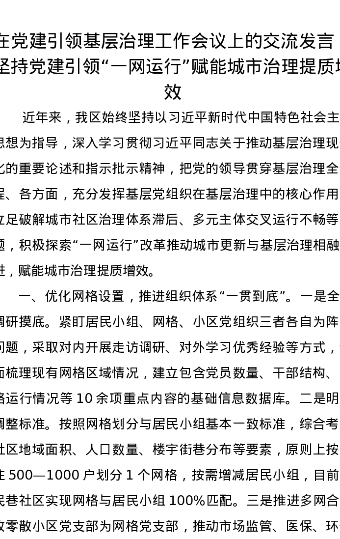在党建引领基层治理工作会议上的交流发言:坚持党建引领“一网运行”赋能城市治理提质增效