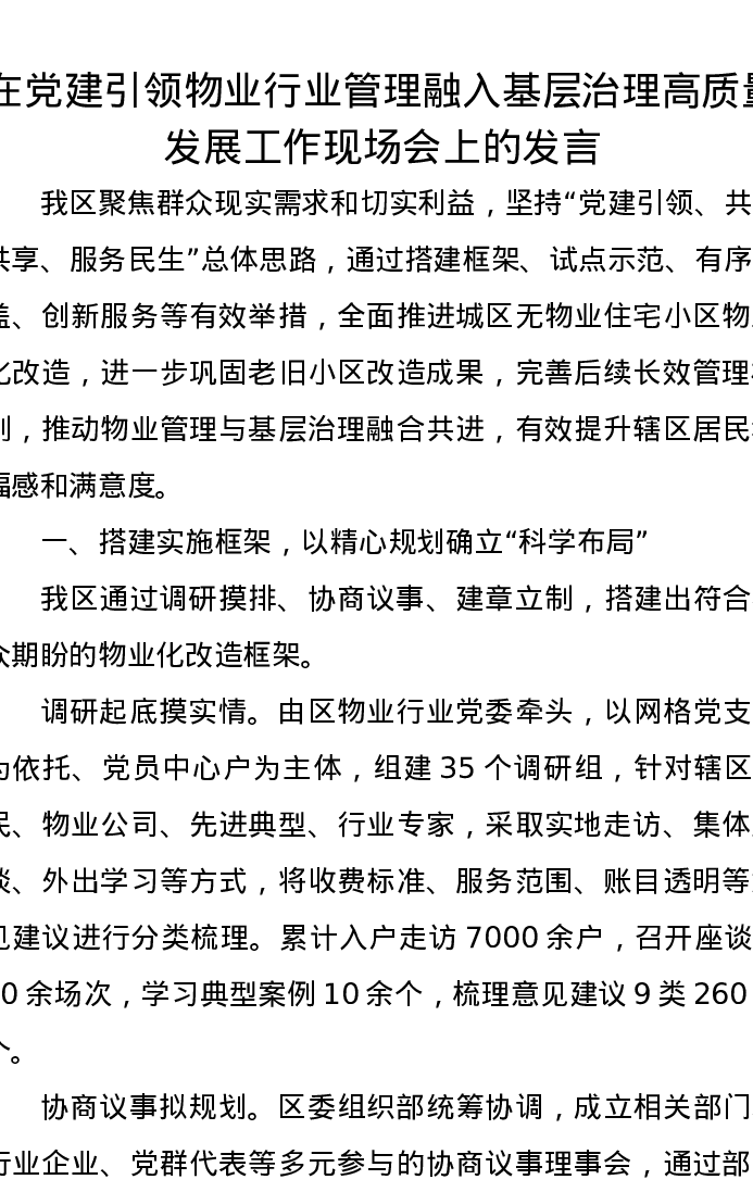 在党建引领物业行业管理融入基层治理高质量发展工作现场会上的发言