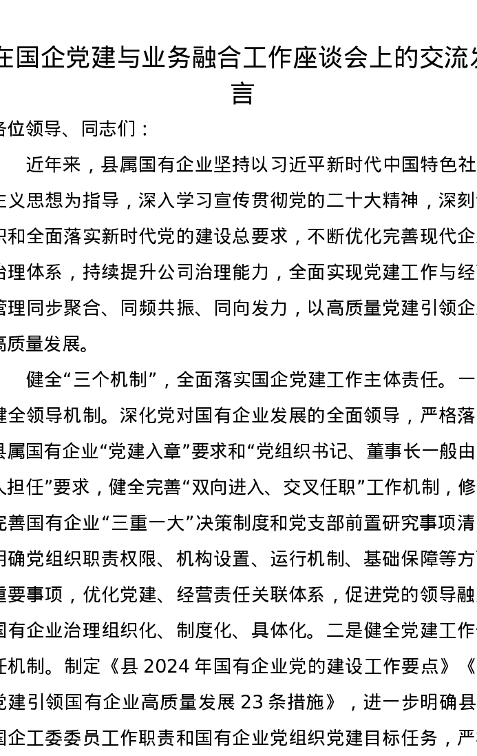 在国企党建与业务融合工作座谈会上的交流发言