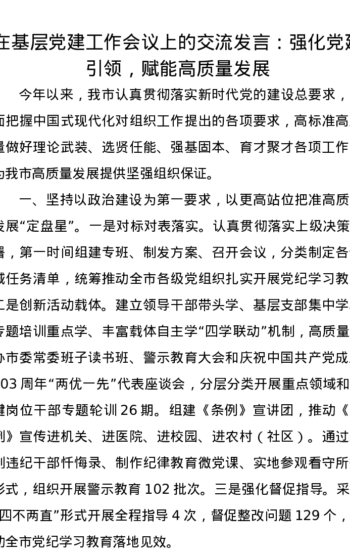 在基层党建工作会议上的交流发言:强化党建引领,赋能高质量发展