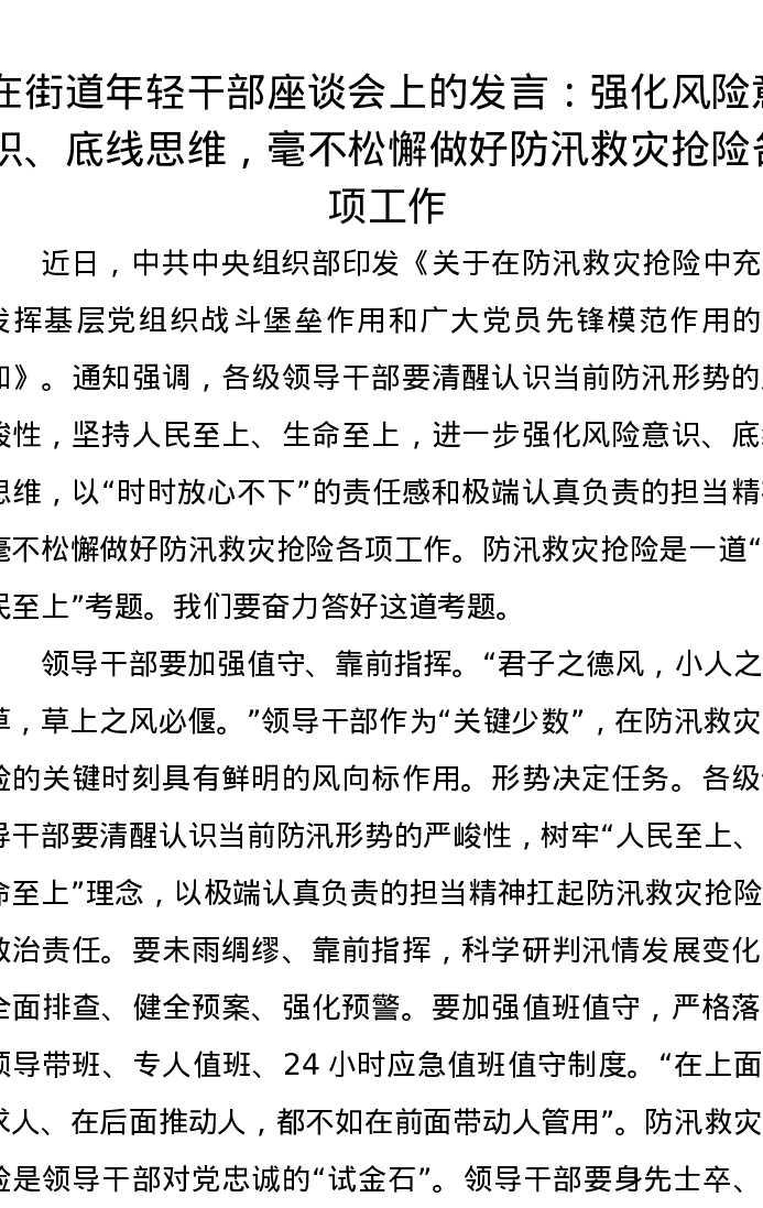 在街道年轻干部座谈会上的发言:强化风险意识、底线思维,毫不松懈做好防汛救灾抢险各项工作