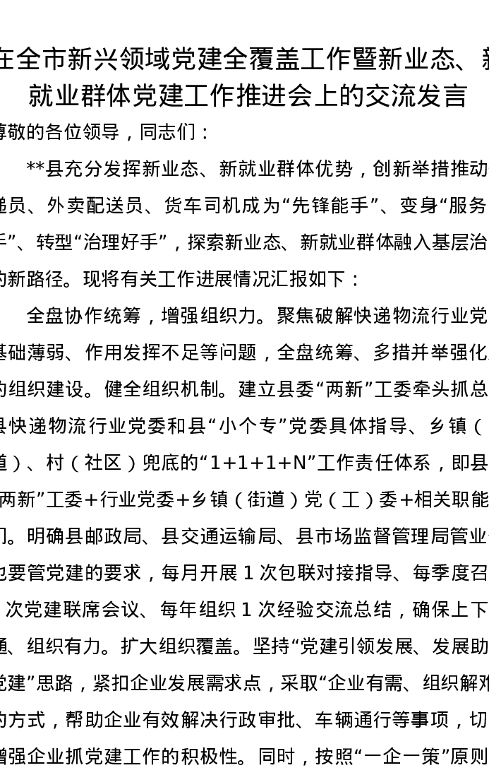 在全市新兴领域党建全覆盖工作暨新业态、新就业群体党建工作推进会上的交流发言