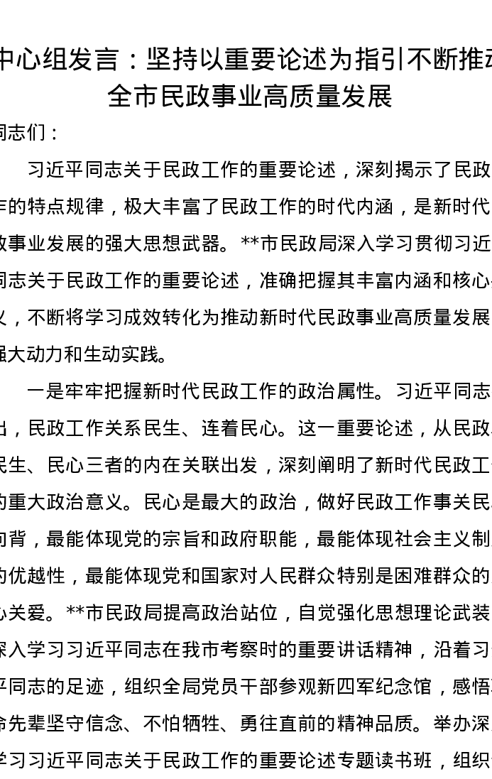 中心组发言:坚持以重要论述为指引不断推动全市民政事业高质量发展