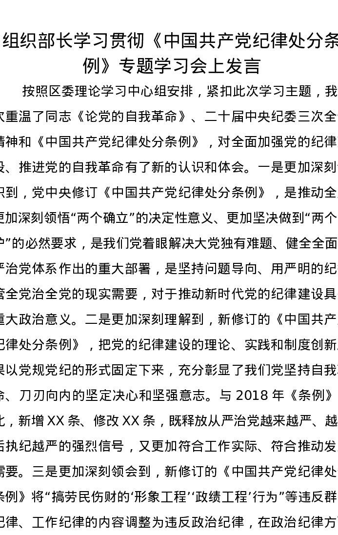 组织部长学习贯彻《中国共产党纪律处分条例》专题学习会上发言