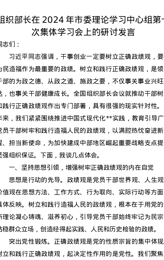 组织部长在2024年市委理论学习中心组第七次集体学习会上的研讨发言