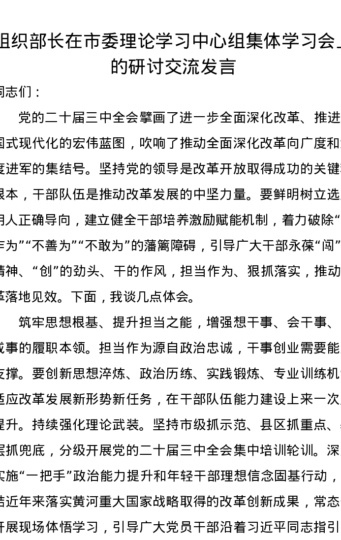 组织部长在市委理论学习中心组集体学习会上的研讨交流发言