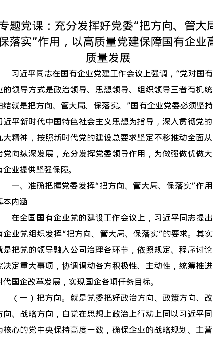 党课讲稿:充分发挥好党委“把方向、管大局、保落实”作用,以高质量党建保障国有企业高质量发展