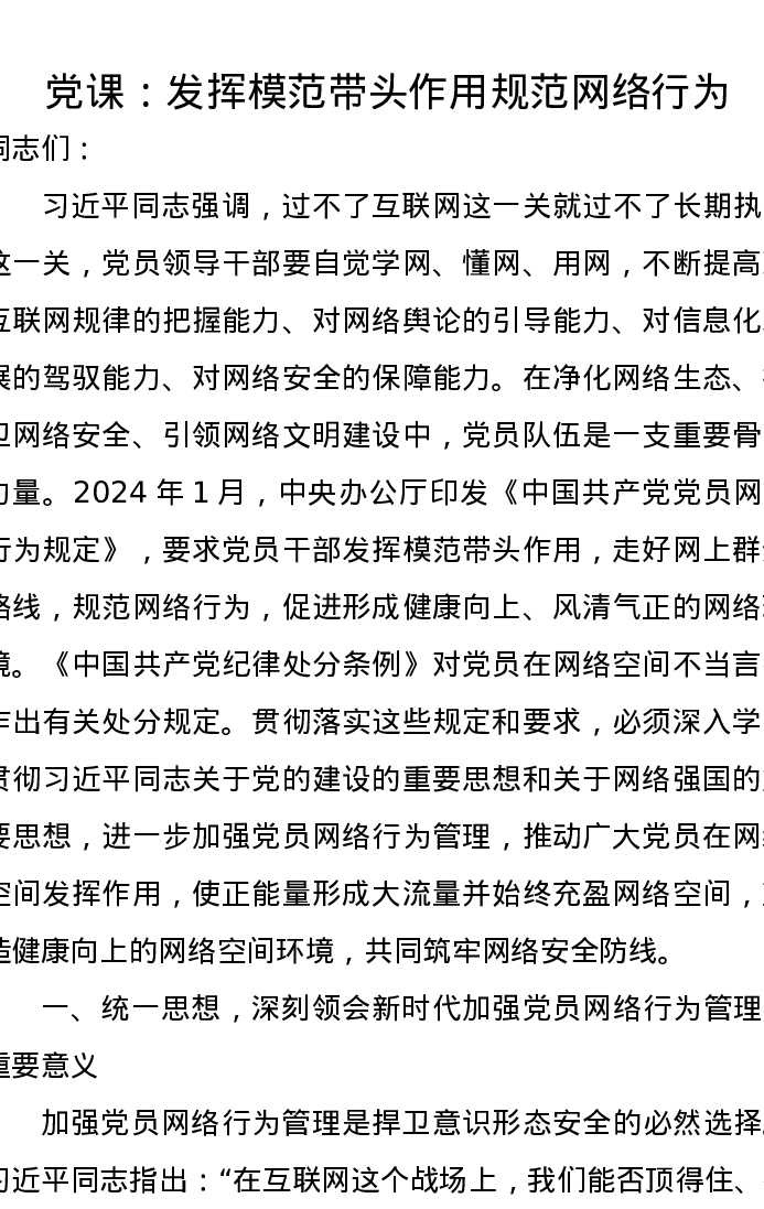 党课讲稿:发挥模范带头作用规范网络行为