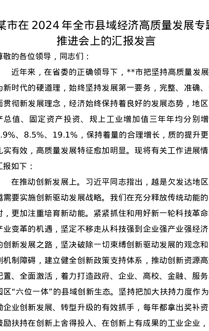 某市在2024年全市县域经济高质量发展专题推进会上的汇报发言