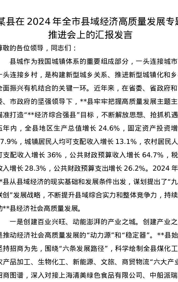 某县在2024年全市县域经济高质量发展专题推进会上的汇报发言