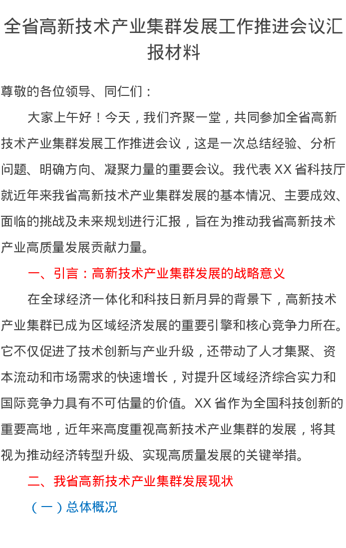 全省高新技术产业集群发展工作推进会议汇报材料