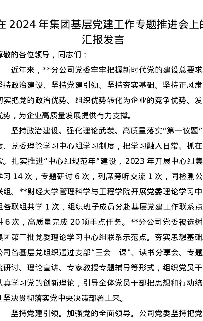 在2024年集团基层党建工作专题推进会上的汇报发言