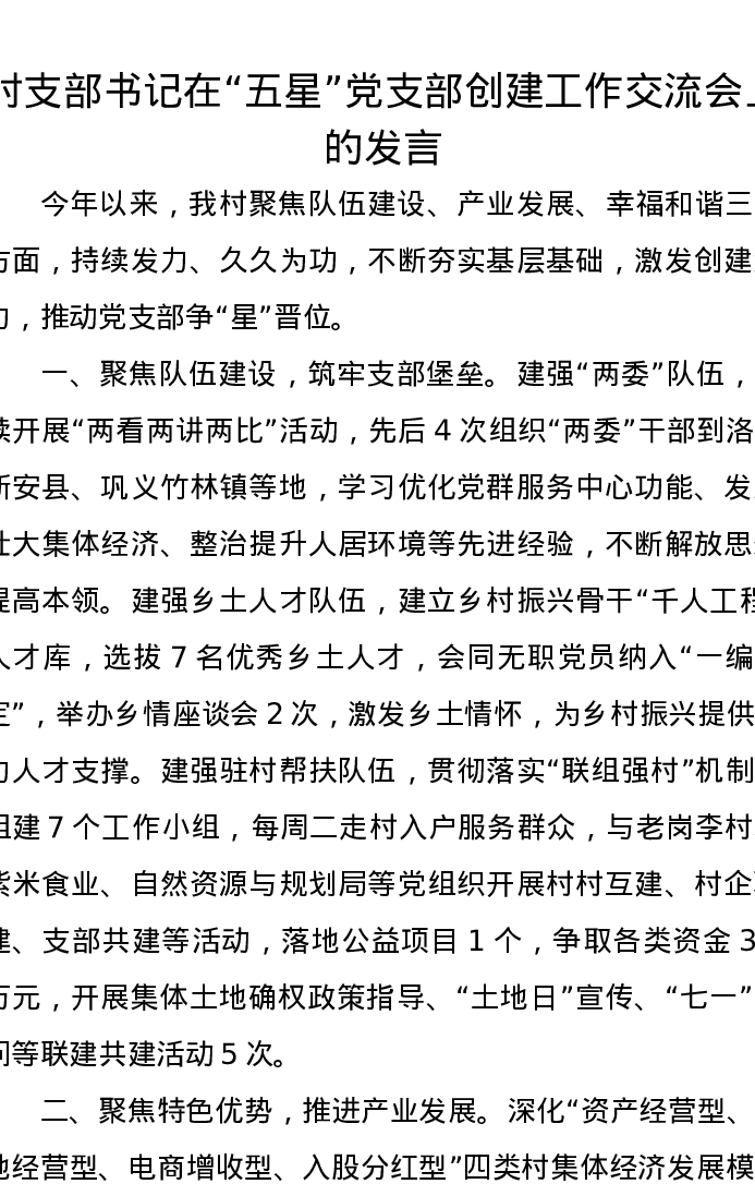 村支部书记在“五星”党支部创建工作交流会上的发言