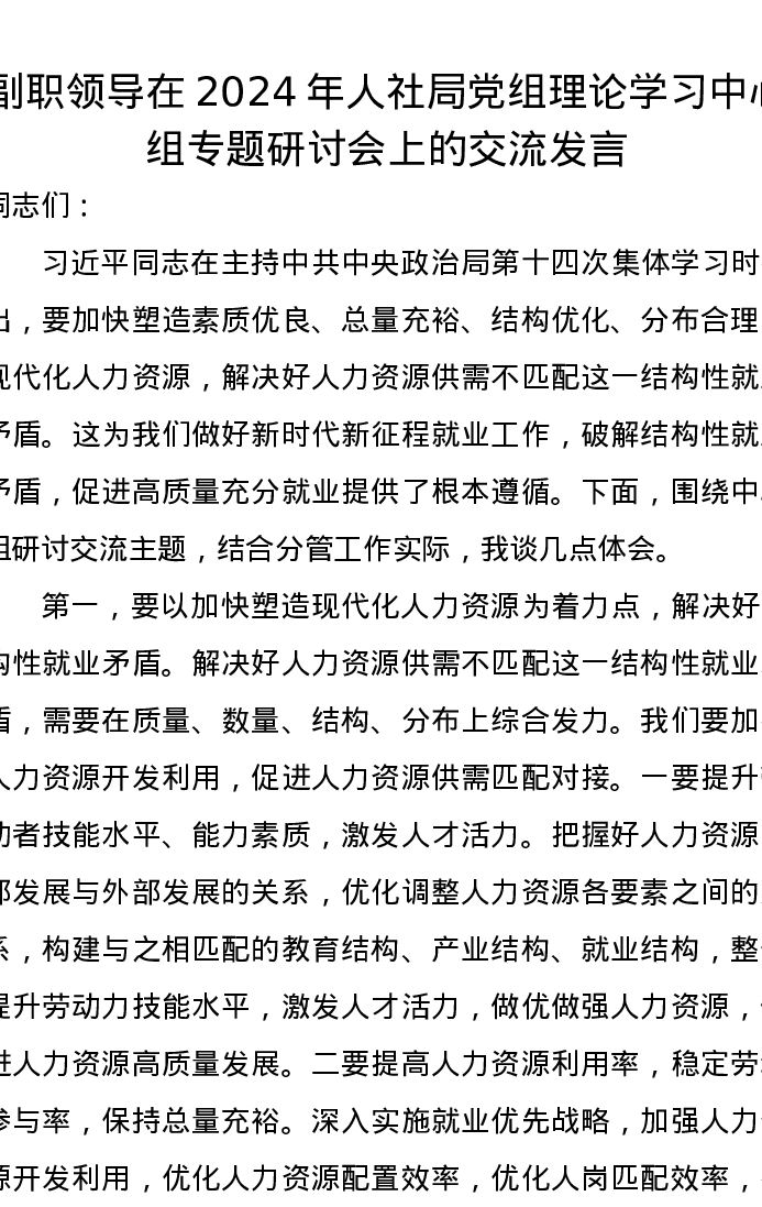 副职领导在2024年人社局党组理论学习中心组专题研讨会上的交流发言
