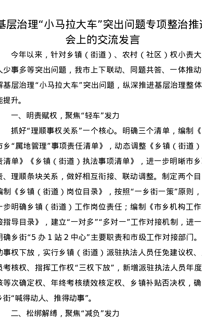 基层治理“小马拉大车”突出问题专项整治推进会上的交流发言