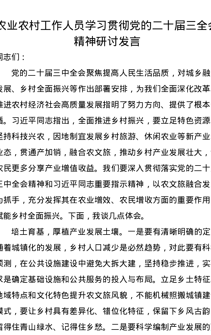 农业农村工作人员学习贯彻党的二十届三全会精神研讨发言