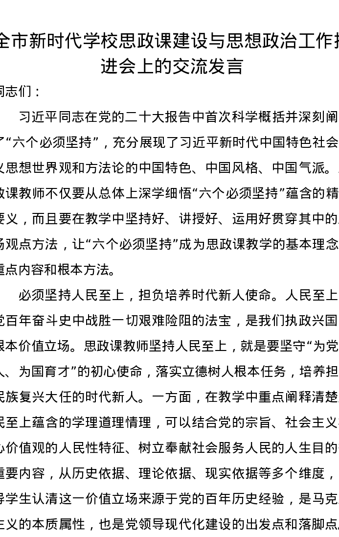 全市新时代学校思政课建设与思想政治工作推进会上的交流发言
