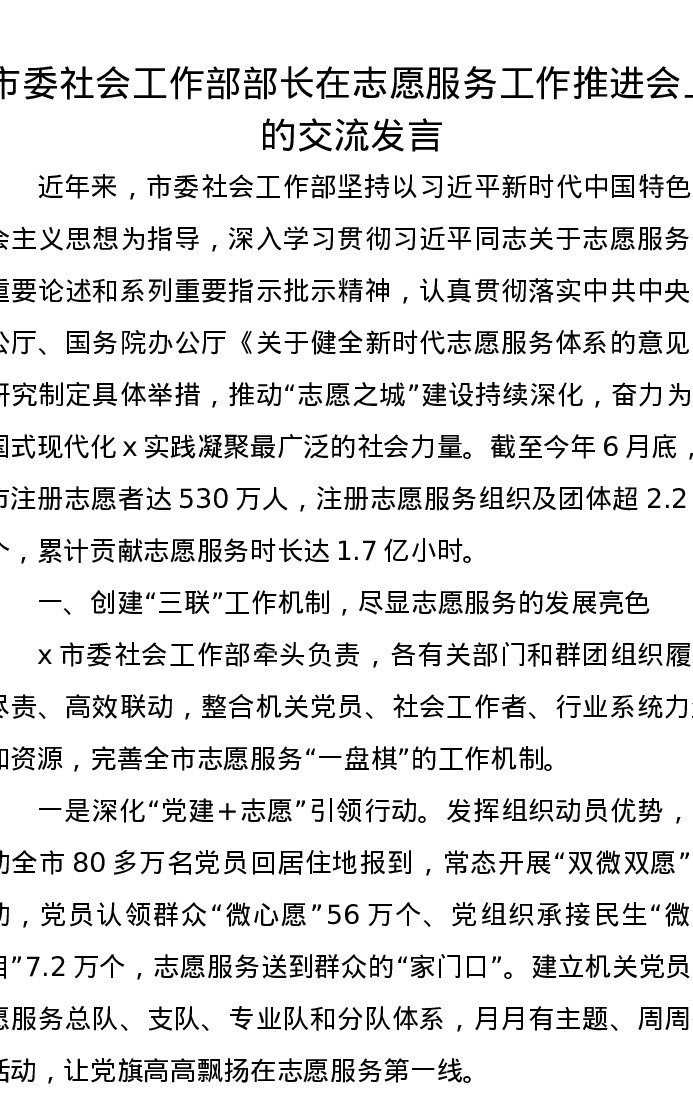 市委社会工作部部长在志愿服务工作推进会上的交流发言