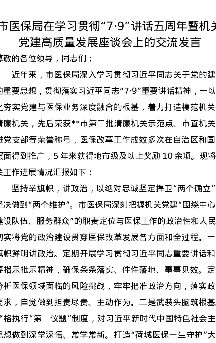 市医保局在学习贯彻“7·9”讲话五周年暨机关党建高质量发展座谈会上的交流发言