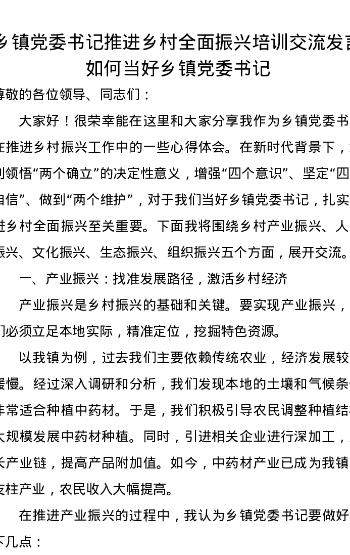 乡镇党委书记推进乡村全面振兴培训交流发言:如何当好乡镇党委书记