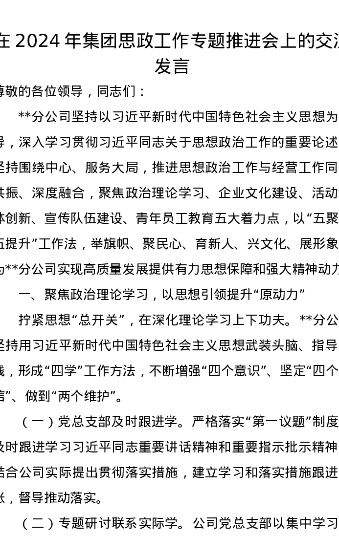在2024年集团思政工作专题推进会上的交流发言