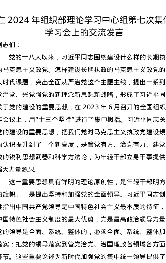 在2024年组织部理论学习中心组第七次集体学习会上的交流发言