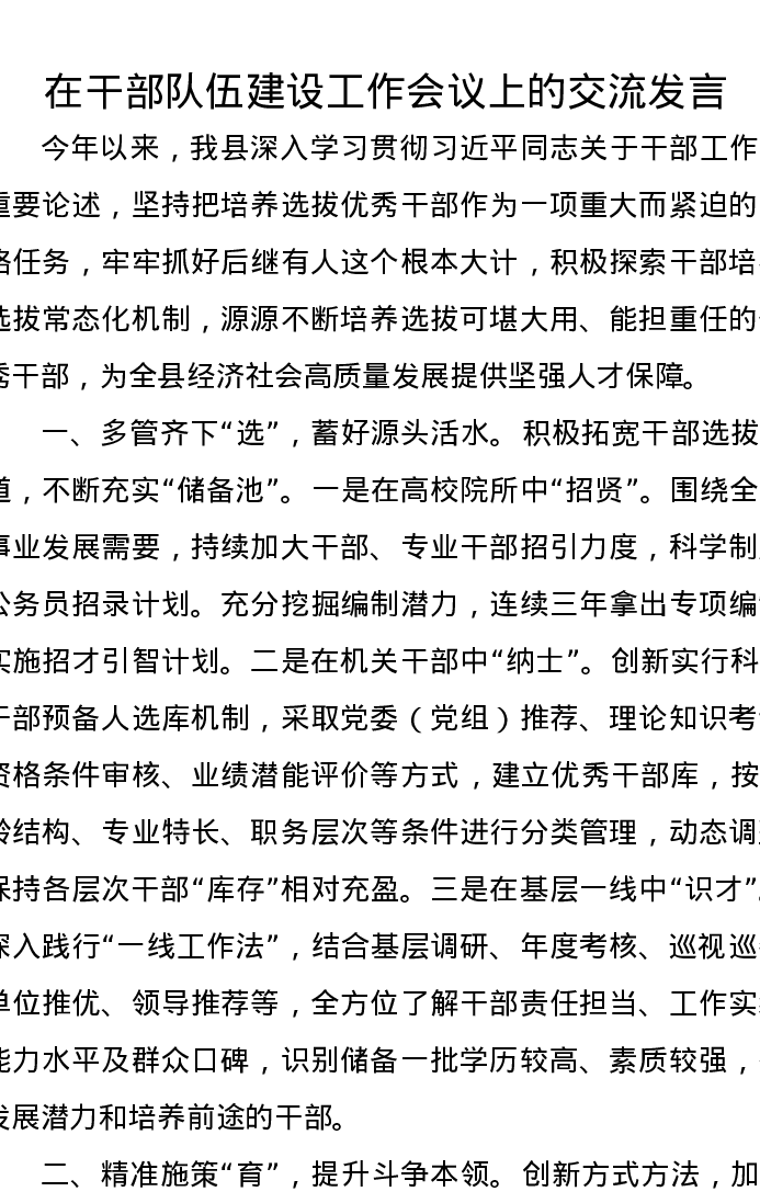 在干部队伍建设工作会议上的交流发言