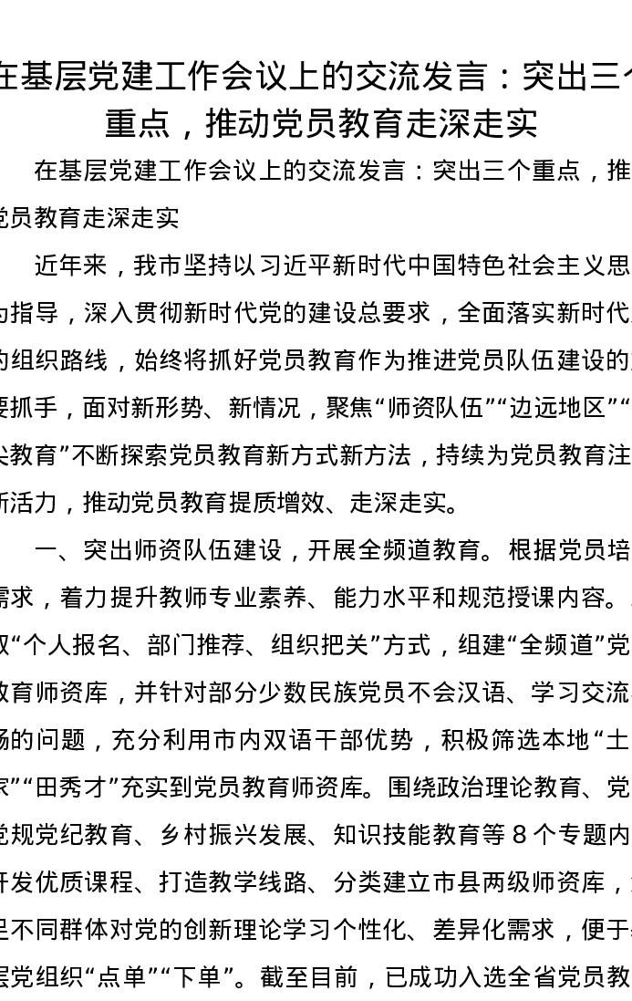 在基层党建工作会议上的交流发言:突出三个重点,推动党员教育走深走实
