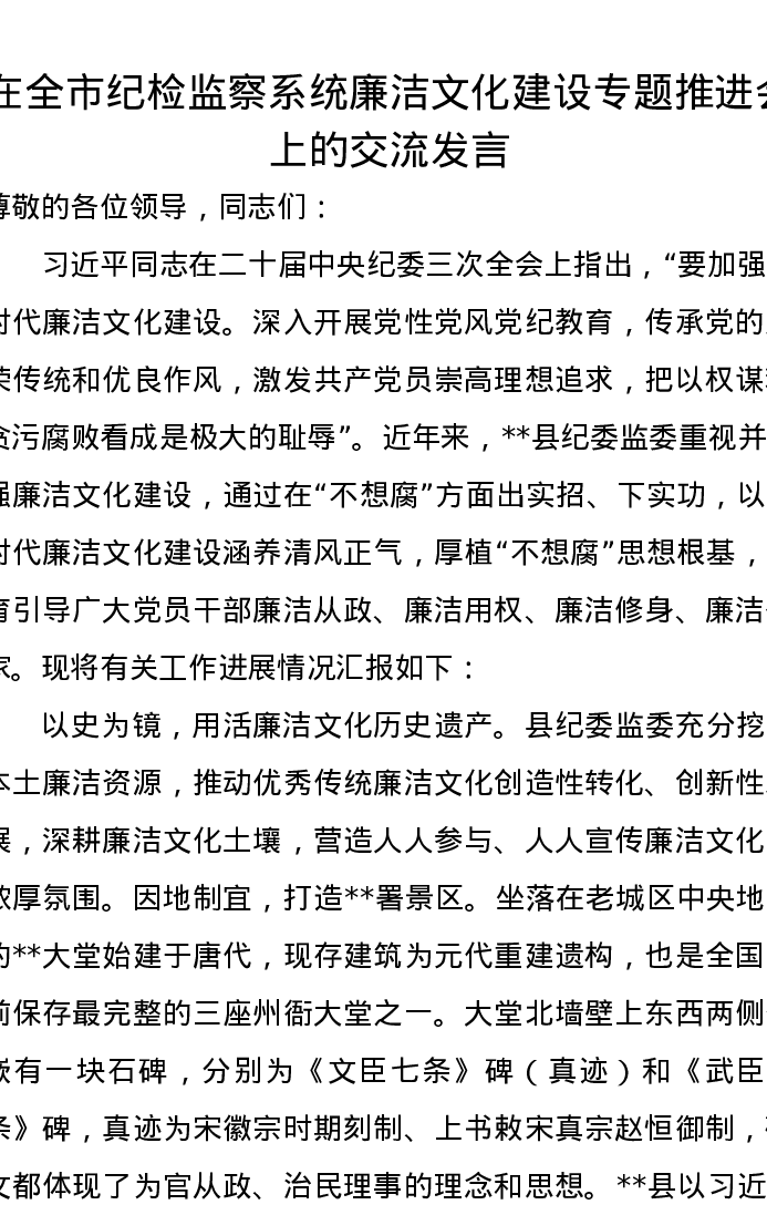 在全市纪检监察系统廉洁文化建设专题推进会上的交流发言