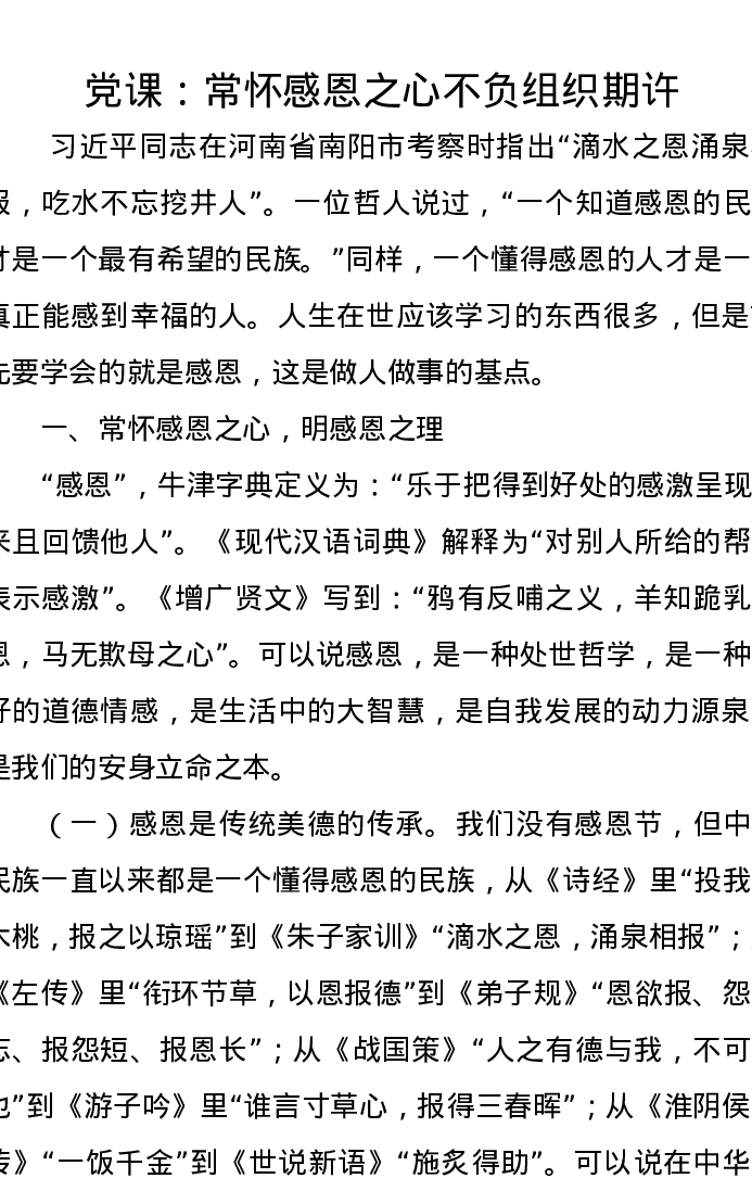 党课讲稿:常怀感恩之心不负组织期许