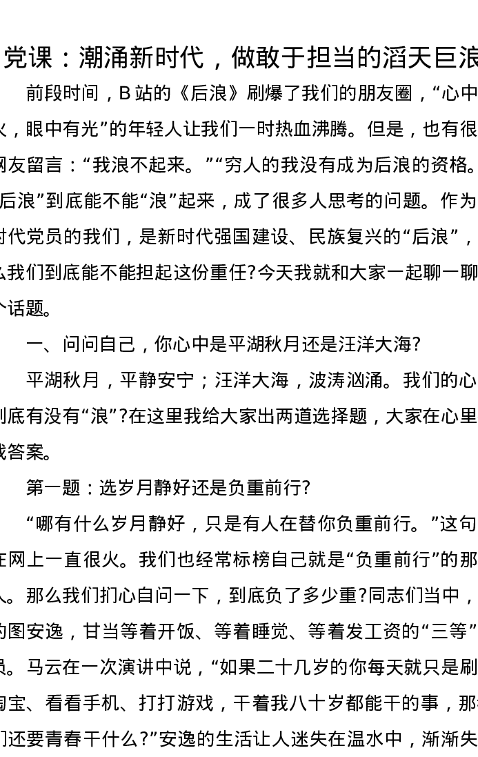 党课讲稿:潮涌新时代,做敢于担当的滔天巨浪