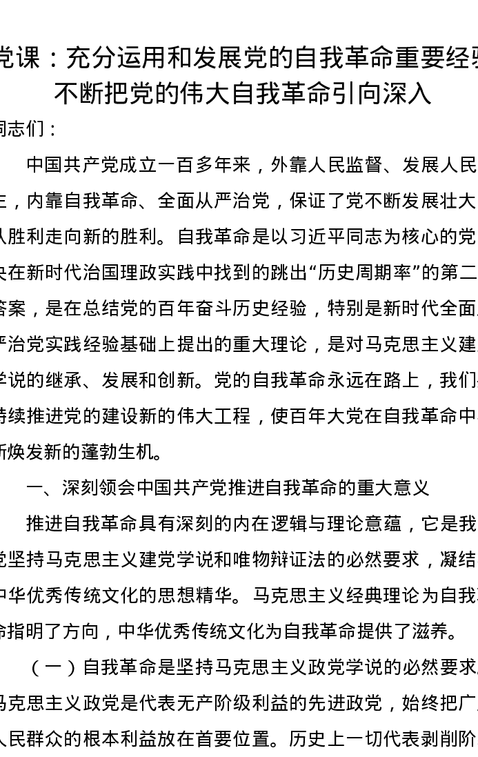 党课讲稿:充分运用和发展党的自我革命重要经验不断把党的伟大自我革命引向深入