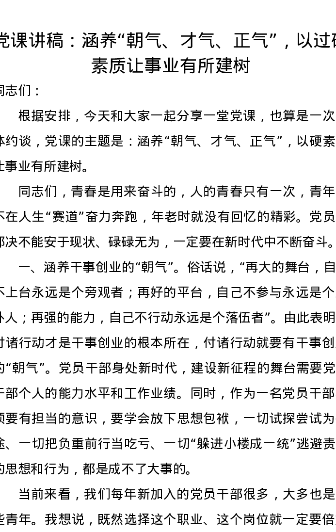党课讲稿:涵养“朝气、才气、正气”,以过硬素质让事业有所建树