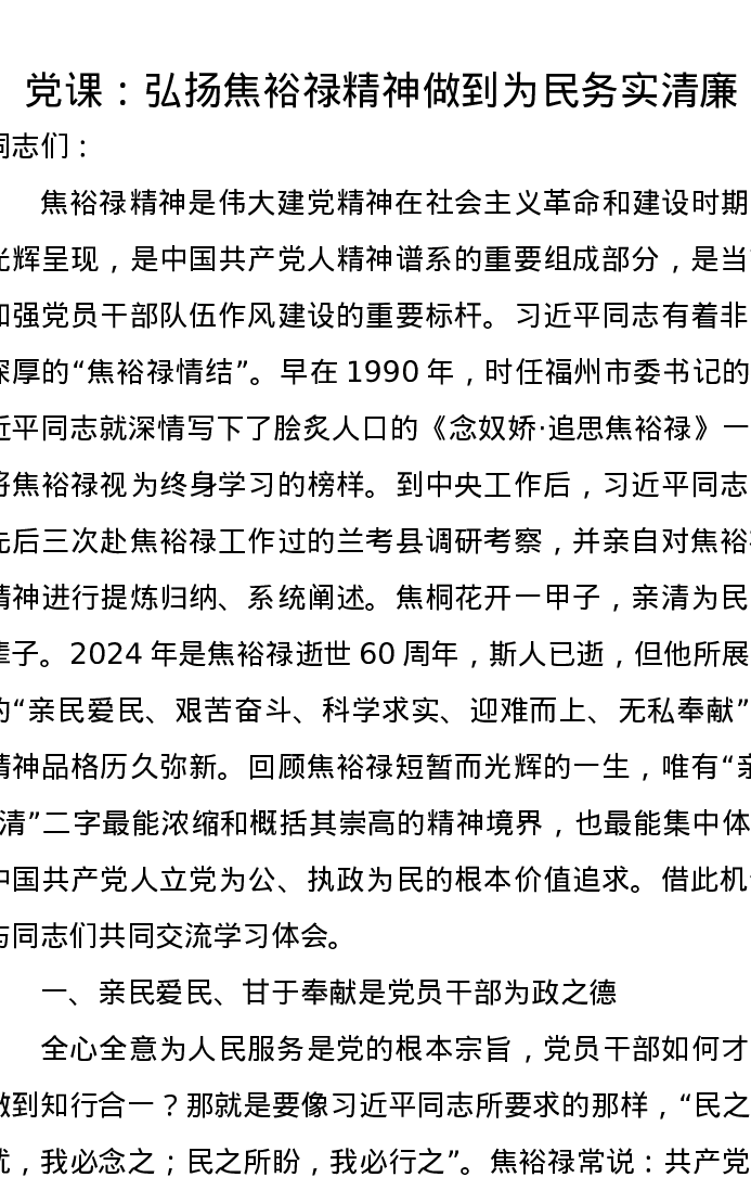党课讲稿:弘扬焦裕禄精神做到为民务实清廉